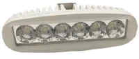 | Housing Finish/Material | Electrostatic satin white epoxy/ADS 12 die-cast aluminum alloy | | Lens Material | PC with UV stabilizers | | Cut-Out Dimensions | 6-1/4" (158mm) W x 1-3/4" (44.5mm) H x 3-3/8" (86mm) D | | Integrated Switch | No | | Input Voltage | 10-32V | | Halogen Equivalency | 100W+ | | Power Consumption | 18W | | Efficiency | 67% (Luminaire) | | Driver | Integrated (constant current) | | Output Color | Cool White | | Luminous Flux | 1200lm | | Correlated Color Temperature (CCT) | 6500K | | Beam Angle | 60° | | Max Operating Temperature | -40dg ~ 80dg C | | Lifetime Hours | 30,000 | | Mounting Method | S.steel bracket (supplied) | | Install Location | Exterior, hard tops, t-tops, overhangs | | Ingress Protection | IP67 | | Class | III | | Electrical Protections | Over-voltage, reverse polarity | | Certifications & Compliance | CE, ROHS | | Warranty | 1 Yr |